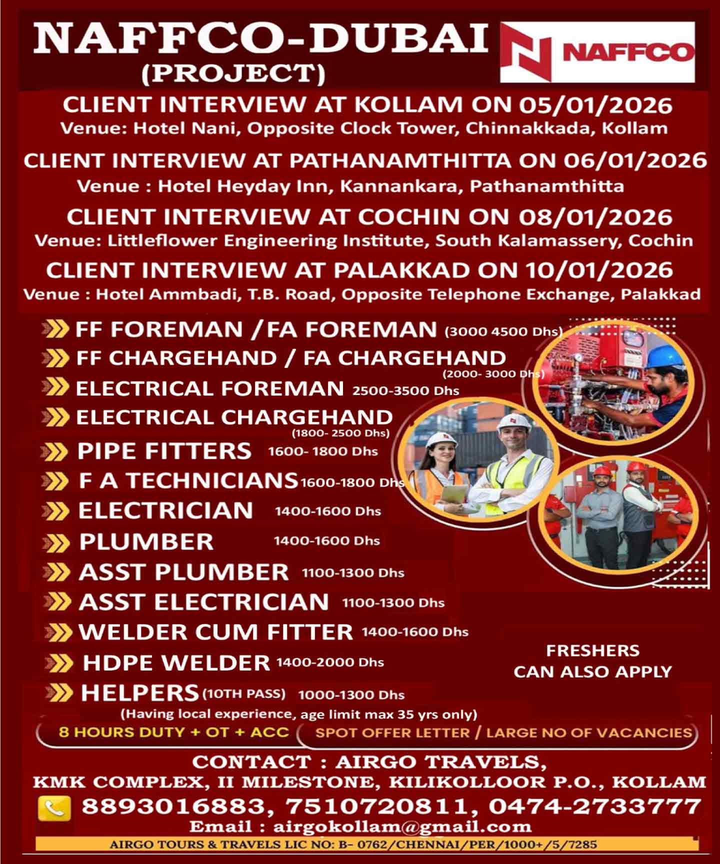 Urgent Manpower Requirement – UAE FIRE FIGHTING & FIRE ALARM PROJECTS Fire Fighting Technicians Job Role at Site: Installation of GI piping, valves, pumps, and firefighting systems Testing, commissioning, and maintenance of firefighting systems Coordination with site engineers and supervisors Fire Alarm Technicians Job Role at Site: Installation, wiring, and termination of fire alarm systems […]